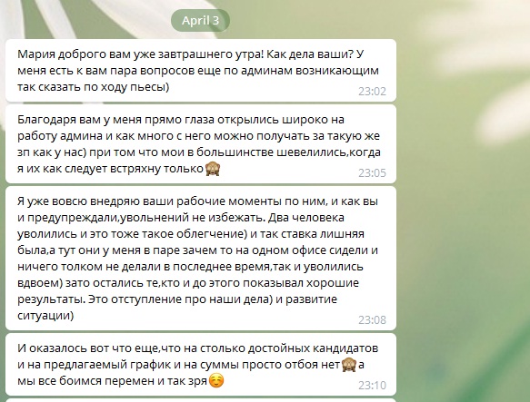 - Когда я еще искала работу, то обратила внимание, что в вакансии уже было подробно указано, чем конкретно занимается администратор. Мне это понравилось, так как я люблю порядок и конкретику. На прошлом рабочем месте были с этим сложности. Во время обучения, конечно, сложно вот так сразу во все вникнуть, но со временем различаешь-понимаешь виды своей деятельности, что от сотрудника хотят и за что платят. И это очень здорово! Все по полочкам, все понятно. Ты администратор и вот твой список обязанностей. Есть набор инструментов, который помогает достичь необходимых результатов. И, конечно, очень приятно получать премию и понимать, что за хорошую работу получаешь бонус. Мне по душе такие порядки))